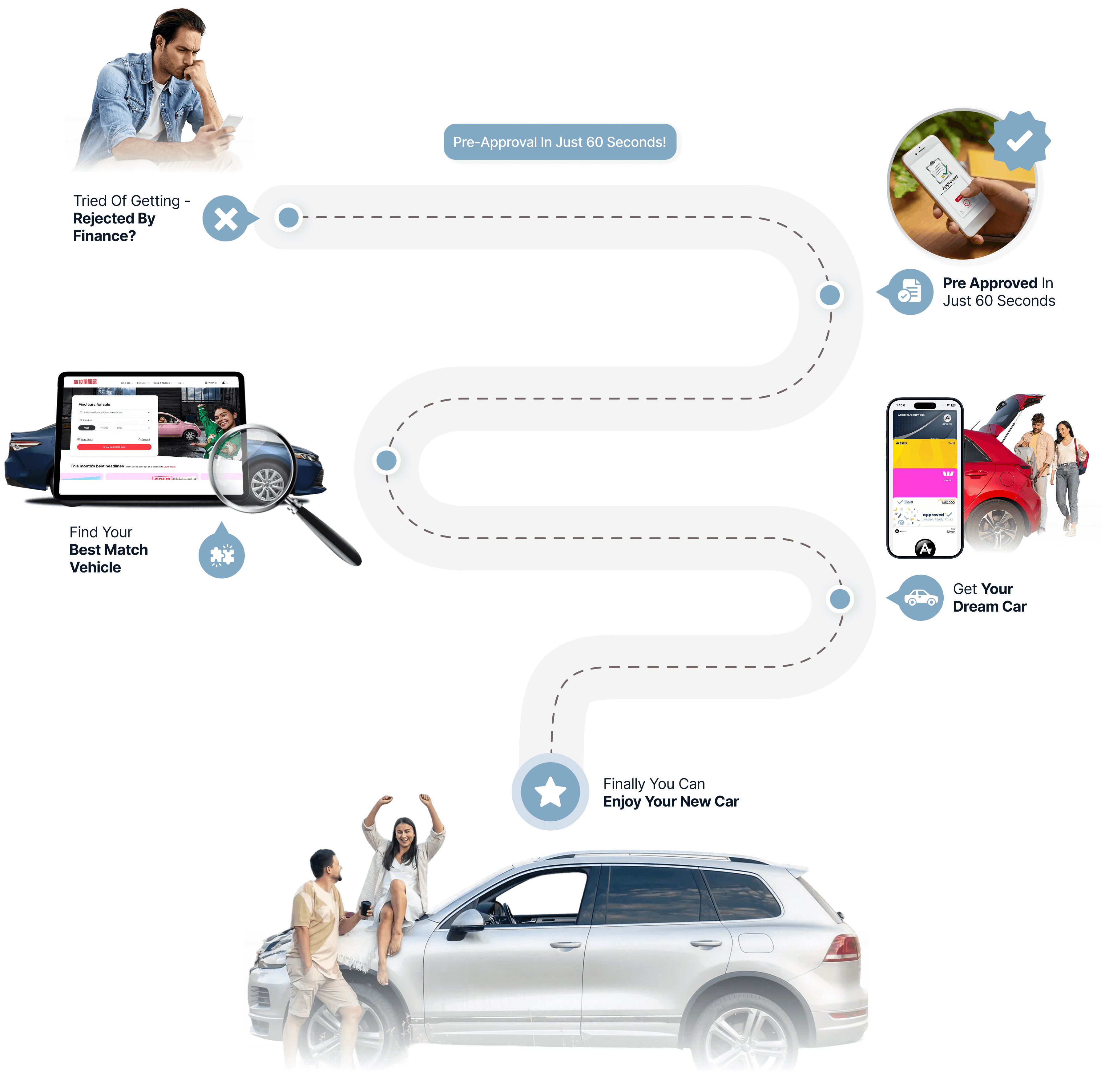 Once you're approved by a lender and complete the paperwork, we load your loan amount onto a Digital CashCard that lives right in your phone's wallet. Now you're not just another buyer hoping a dealer will work with you. You're like a cash buyer. Sellers take you seriously. You negotiate from a position of strength. And because you've already got the finance sorted, you're not pressured into dealership loans with inflated rates. You choose the car you want, at the price you deserve, with repayments that actually fit your family's budget. We’ll even help you find your dream car - for free.
